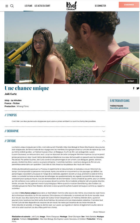 Une chance unique – sur le site de Brefcinéma sélectionné parmi les coups de coeurs du Festival du court-métrage de Clermont-Ferrand en savoir plus sur le film : ICI